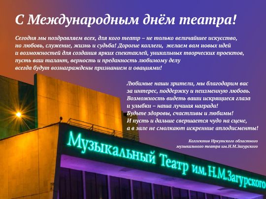 Уважаемые жители Иркутской области! Примите искренние поздравления с Всемирным днём театра!